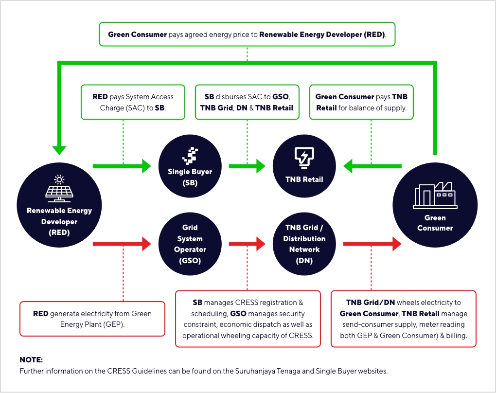 Under the Corporate Renewable Energy Supply Scheme (CRESS), renewable energy is physically delivered from a Renewable Energy Developer (RED) to the corporate consumer through TNB’s grid under the Third-Party Access (TPA) framework. The corporate buyer pays the RED for the renewable electricity at an agreed rate, while also paying TNB a System Access Charge (SAC) for using the grid to transmit and distribute the energy — similar to a “toll fee.” This structure allows businesses to directly consume green energy while leveraging TNB’s grid reliability, making CRESS a practical path for large and listed companies to achieve their sustainability and decarbonisation goals.