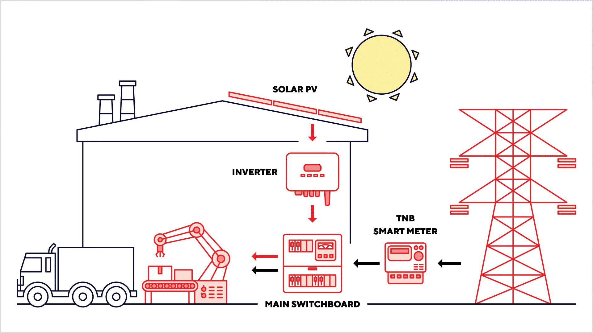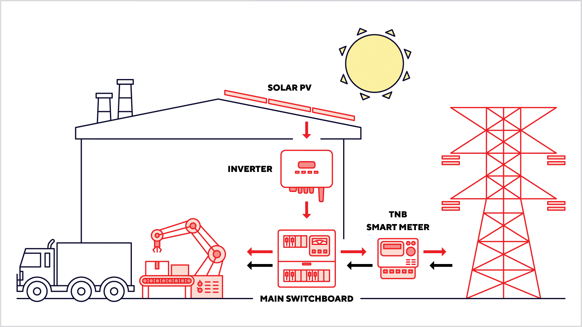 NEM allows electricity consumers to benefit from solar PV energy. The solar energy generated will be consumed by the building first, and any excess energy will be exported to the national grid to offset the TNB electricity bill.